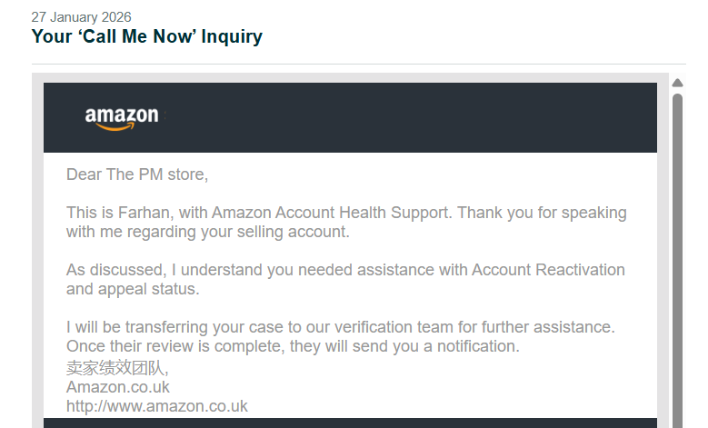 the latest notification from amazon on 27th jan after the call was the following: