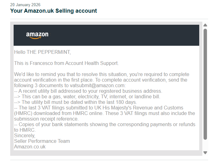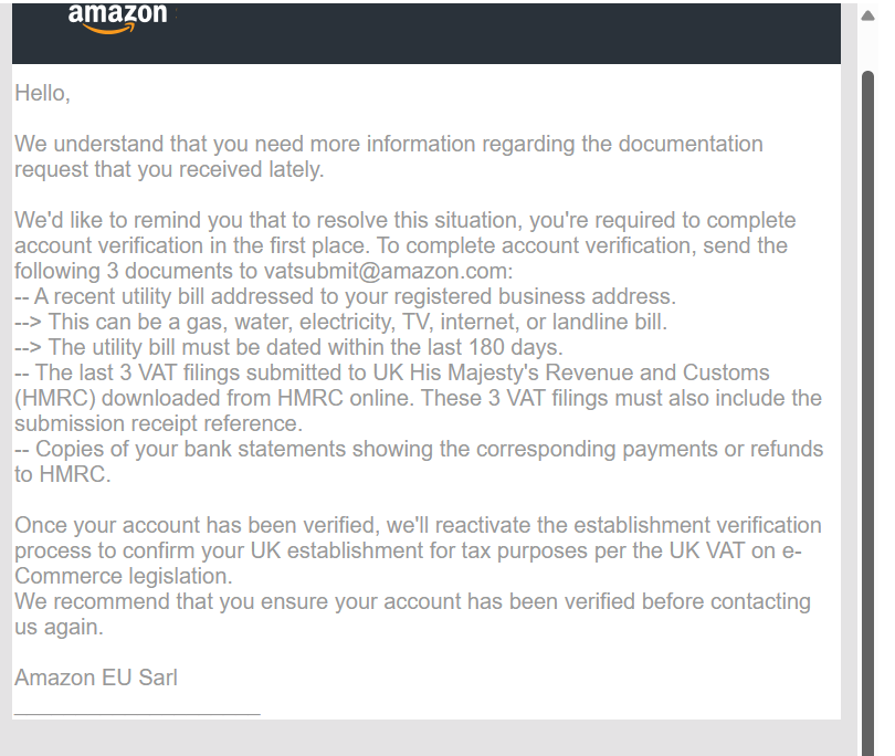 Sellers in similar situations have reported that once these automated systems are triggered, the review can legitimately take several weeks, often 7 to 14 business days and in some cases up to three or four weeks, especially if VAT or compliance teams are involved rather than standard Seller Support, and repeated document requests or minor discrepancies can easily extend the timeline.
