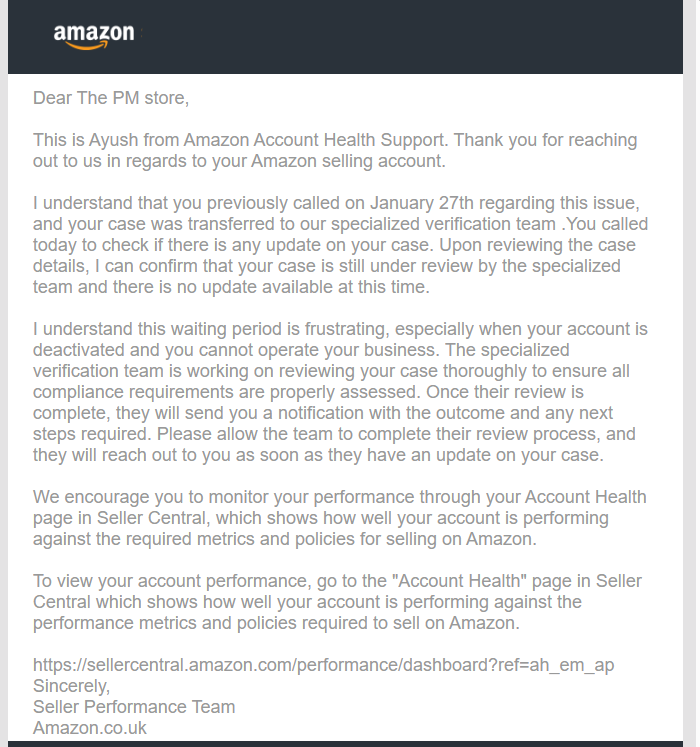 One key point others have mentioned is that even if all documents have already been submitted, repeatedly replacing or re-uploading them can actually reset the internal review clock, so it is usually better to wait unless Amazon explicitly asks for new or additional documents. If there is no progress after around three weeks, the most effective escalation reported is replying directly to the original performance or compliance notification thread requesting a status update, or contacting the compliance email referenced in the notification with the same case ID, rather than opening new generic cases that often go nowhere.