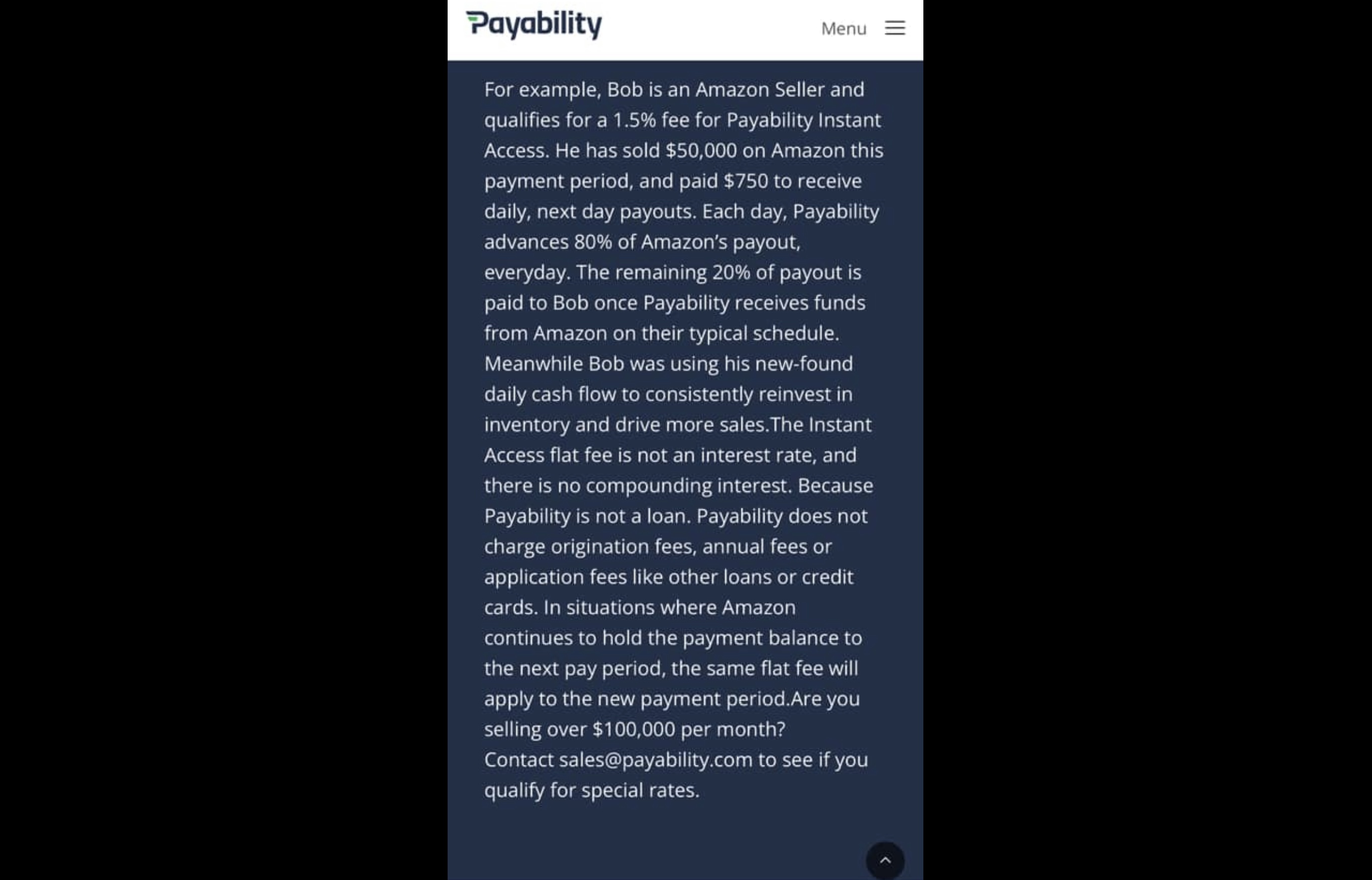 How it works is the have your full amazon balance in their dashboard which is essentially there money then lend it to you, lets say you had you nothing to disburse out of out amazon but you want to get some funds out but you can’t as it is not available you can get it from their dashboard and pay a fee.