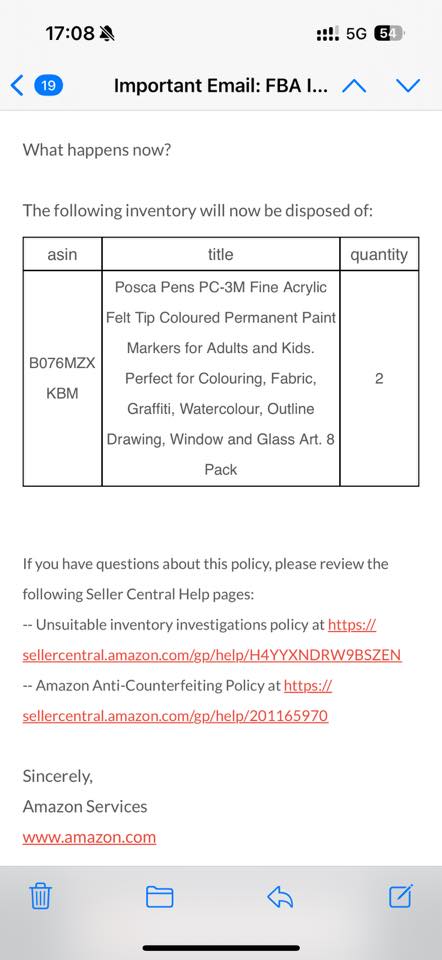 About 90+ days ago, I received my first ever IP complaint (counterfeit) for a Posca Markers product from the brand owner. I didn’t submit an appeal since I don’t have documentation for that item. Amazon has now sent me a final notice that they’ve disposed of the inventory (2 units).