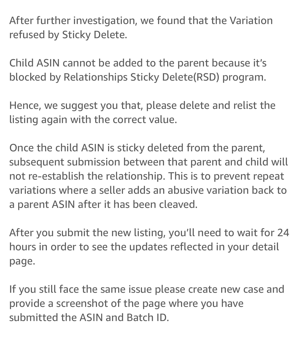Delete both parent and child listings wait 24 hours and then relist it again. Hope this will work for you.
